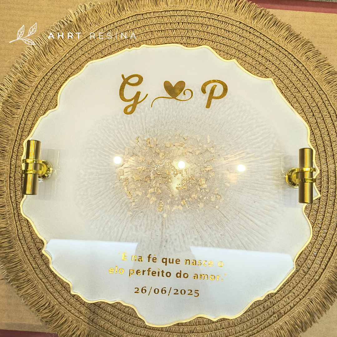 Bandeja geodo em resina com alça dourada em aço inoxidável com arte personalizada. O produto pode ser personalizado em outras cores (prazo de 10 dias úteis após a aprovação do pagamento). Tamanho aproximado: 29 cm largura x 29 cm de profundidade.