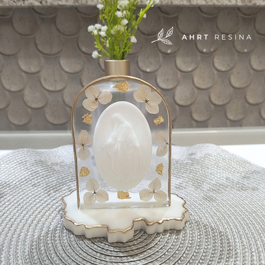 Imagem de Nossa Senhora das Graças em resina com flor seca, base em resina. O produto pode ser personalizado em outras cores (prazo de 10 dias úteis após a aprovação do pagamento). Tamanho aproximado com a base: 11 cm largura x 12 de altura.